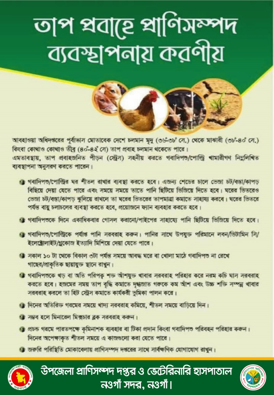 ১ জাতীয় প্রাণিসম্পদ সপ্তাহ-২০২৫ এর অনুষ্টান সময় সূচী ২৫-১১-২০২৫ দেখুন ২ প্রাণিসম্পদ পদক নীতিমালা ১৪-১০-২০২৫ দেখুন ৩ প্রাণিসম্পদ পদক বিজ্ঞপ্তি ১৪-১০-২০২৫ দেখুন ৪ বার্ষিক ক্রয় পরিকল্পনা ২০২৫-২০২৬ ৩০-০৭-২০২৫ দেখুন ৫ পশু কুরবানী দেওয়ার ক্ষেত্রে জরুরি বিবেচ্য বিষয় সম্পর্কিত লিফলেট ০৬-০৫-২০২৫ দেখুন ৬ “সমতল ভূমিতে বসবাসরত অনগ্রসর ক্ষুদ্র নৃ-গোষ্ঠির আর্থ-সামাজিক ও জীবন মানোন্নয়নের লক্ষ্যে সমন্বিত প্রাণিসম্পদ উন্নয়ন প্রকল্প” এর আওতায় মুরগী পালন প্যাকেজের সুফলভোগীদের মাঝে উপকরণ (মুরগী ও মুরগীর খাদ্য) বিতরণ অনুষ্ঠান ২৭-০৪-২০২৫ দেখুন ৭ তাপ প্রবাহে প্রাণিসম্পদ ব্যবস্থাপনায় করণীয় সম্পর্কিত লিফলেট ২০-০৪-২০২৫ দেখুন ৮ আসন্ন পবিত্র ঈদ-উল ফিতর উপলক্ষে ছুটিকালীন সময়ে গবাদী পশুপাখির জরুরী চিকিৎসা সেবা চালু রাখার জন্য কর্মকর্তা-কর্মচারীদের দায়িত্ব বন্ঠন ২৫-০৩-২০২৫ দেখুন ৯ ২০/১০/২০২২ খ্রিঃ তারিখে ভেটেরিনারি হাসপাতাল, নওগাঁ সদরে বাছুরের বিরল রোগ "হাইড্রোসেফালাস" এর সফল অপারেশন সম্পন্ন হয়েছে ২১-১০-২০২২ দেখুন